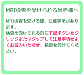 MRI検査費用は、健康保険適応3割負担の方で約7,000円-約9,000円くらいとなります。