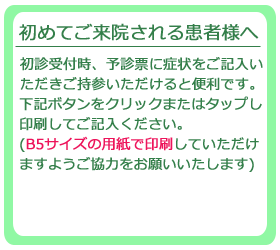 また、気になる症状や質問したい点などがございましたらメモをご用意いただくか、予め予診票に印刷後、ご記入いただくことをお勧めいたします。
