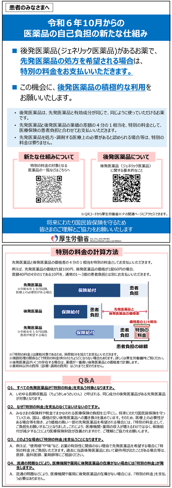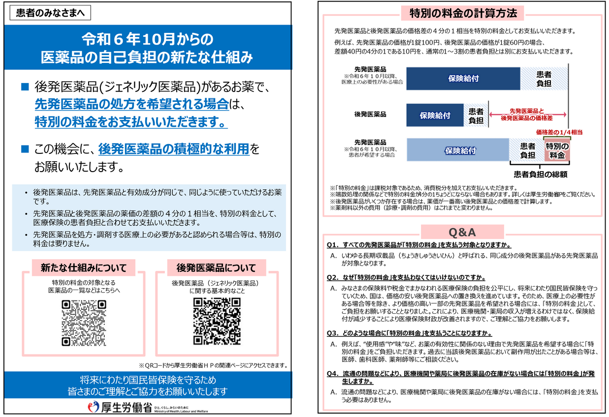 厚生労働省より後発医薬品がある場合でも先発医薬品をご希望の場合は、特別料金をお支払いいただくこととなりました。